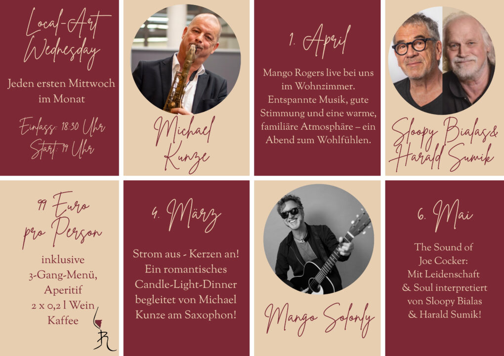 Local-Art-Wednesday 2026 Beitragsnavigation Previous post Bistro Chez Reinhardt 0 comments on “Local-Art-Wednesday 2026” Add yours → Schreibe einen Kommentar Antwort abbrechenDeine E-Mail-Adresse wird nicht veröffentlicht. Erforderliche Felder sind mit * markiertKommentar * Name * E-Mail-Adresse * Website Meinen Namen, meine E-Mail-Adresse und meine Website in diesem Browser für die nächste Kommentierung speichern. Benachrichtige mich über nachfolgende Kommentare via E-Mail. Benachrichtige mich über neue Beiträge via E-Mail.